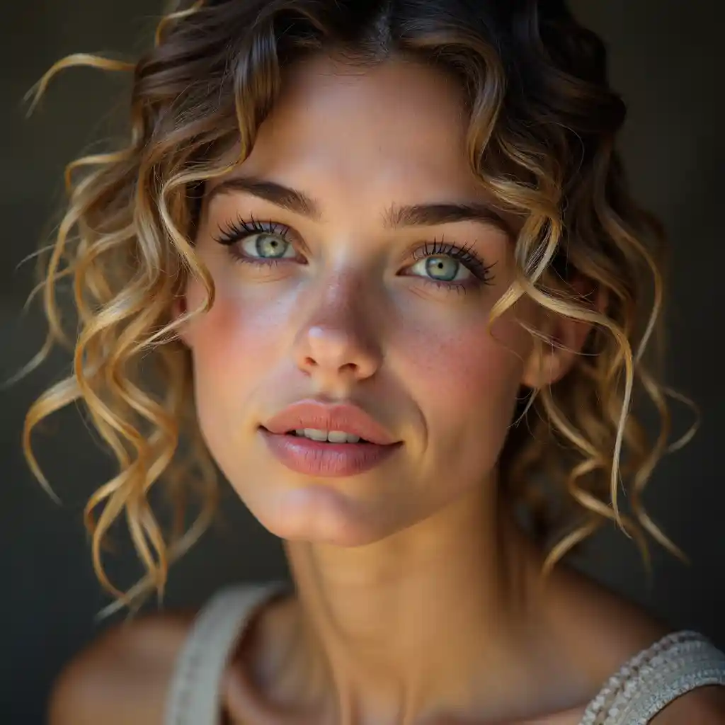 25-vuotias tumman ruskettu nainen , jolla on kiharat vaaleat hiukset ja tummat juuret . Isoja harmaita silmiä, kauniita silmäripssiä, hyvin suuria vaaleanpunaisia huulia, pehmeää nenää, vaaleanpunaisia poskia, realistista muotokuvaa.