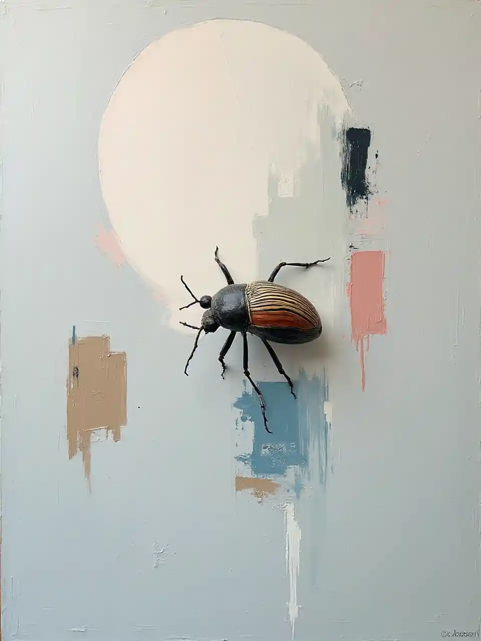 ruslanaPeinture abstraite post-moderne, fond gris clair avec forme de peinture à l'huile, un ver réaliste rampe sur l'image