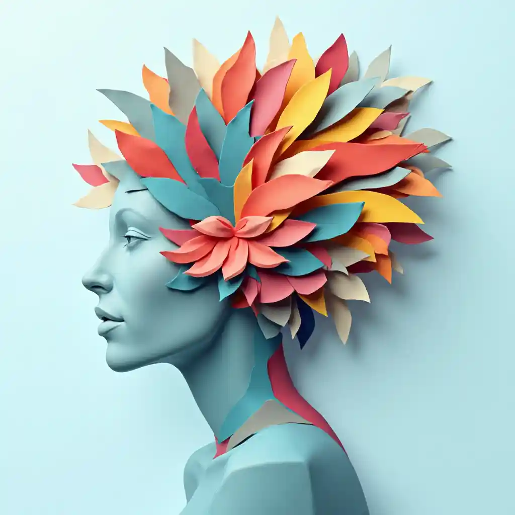 Une tête de femme, forme organique minimaliste et colorée, énergie, assemblage, superposition, profondeur, vitalité vivante, 3D, abstraction, fond bleu clair