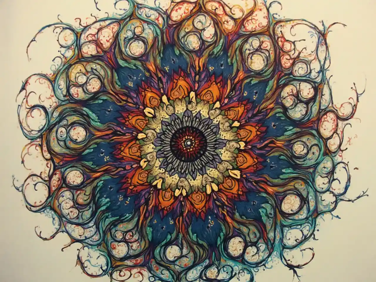Une mandala abstraite, aux tourbillons de couleurs et aux formes indéfinies.