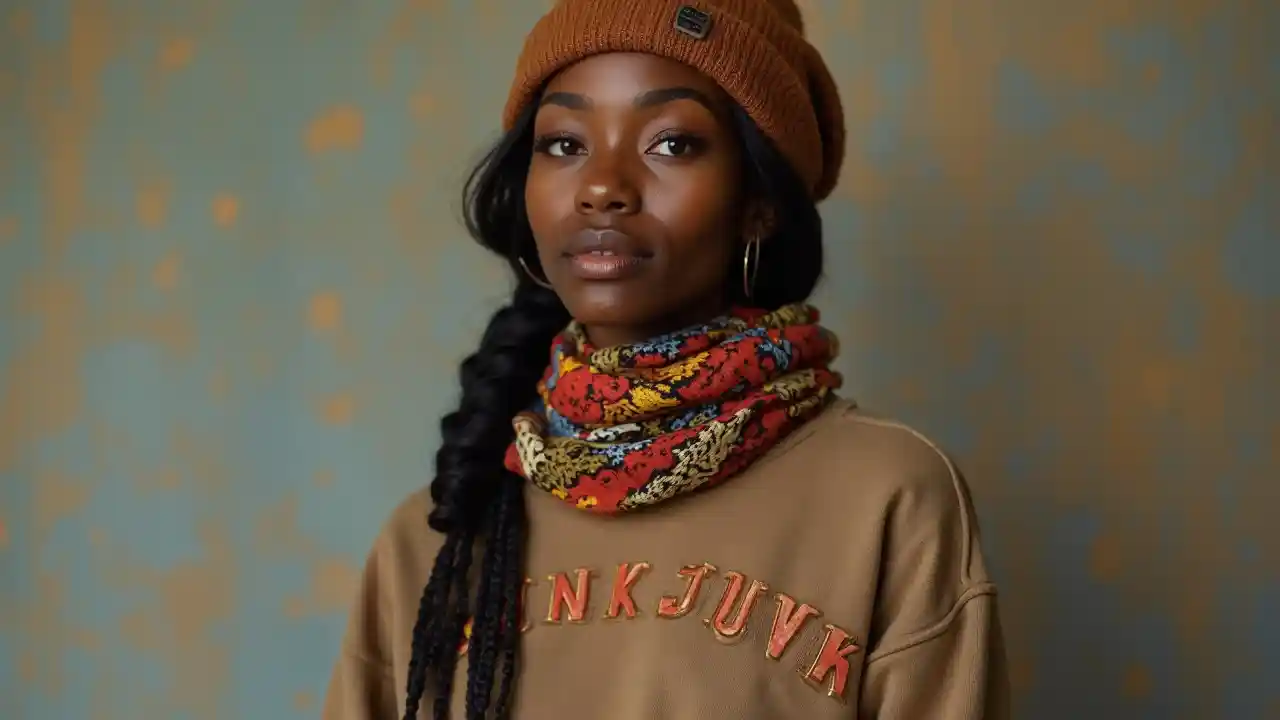 Une mannequin africaine, vêtue d'un bonnet marron, d'un sweat-shirt avec l'inscription JUNKJVNK et d'une écharpe africaine autour du cou.