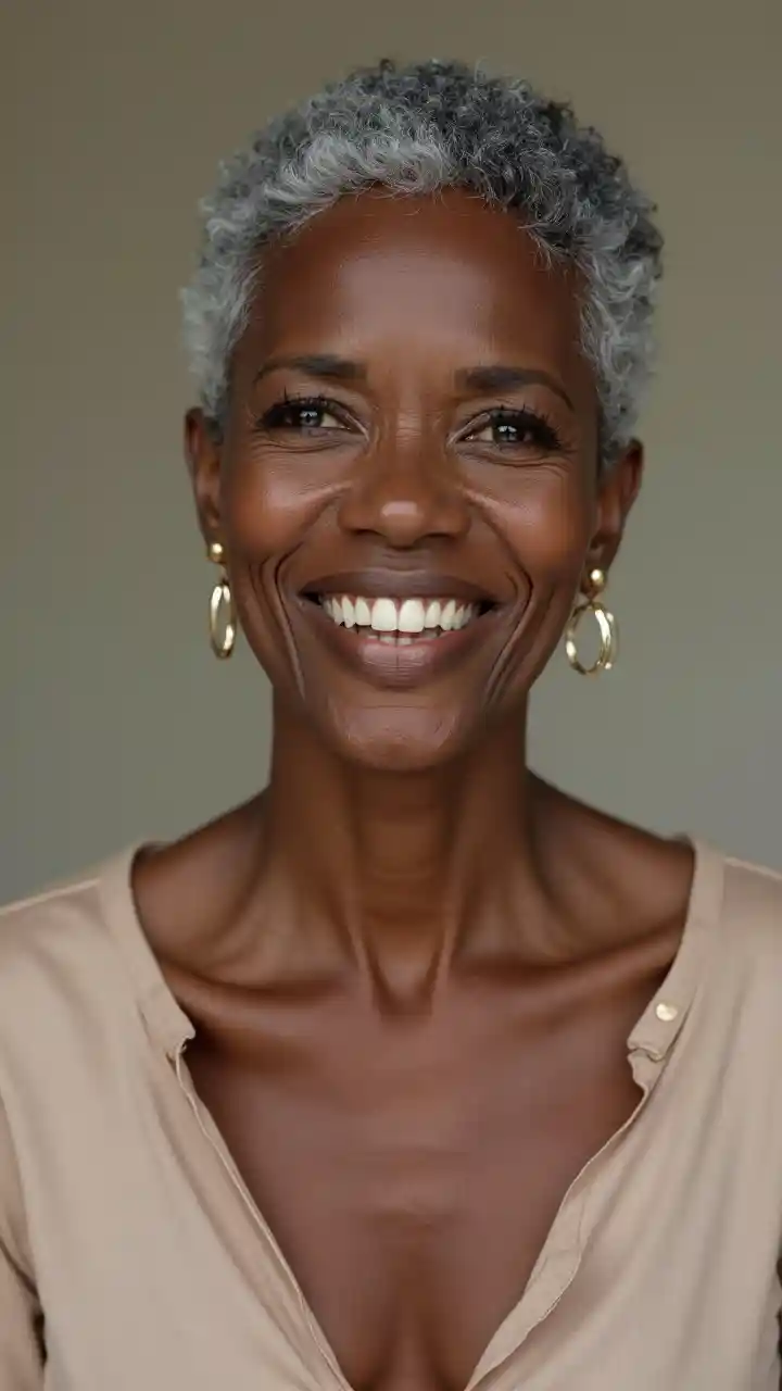 Supermodel africaine de 40 ans, maquillage naturel classique Chanel et belle coiffure, beaux pores et peau, décolleté ouvert dans un haut neutre uni, image haute résolution des détails, cheveux gris, image naturelle de style Clinique, lumière douce, expression douce, elle se contente de son âge