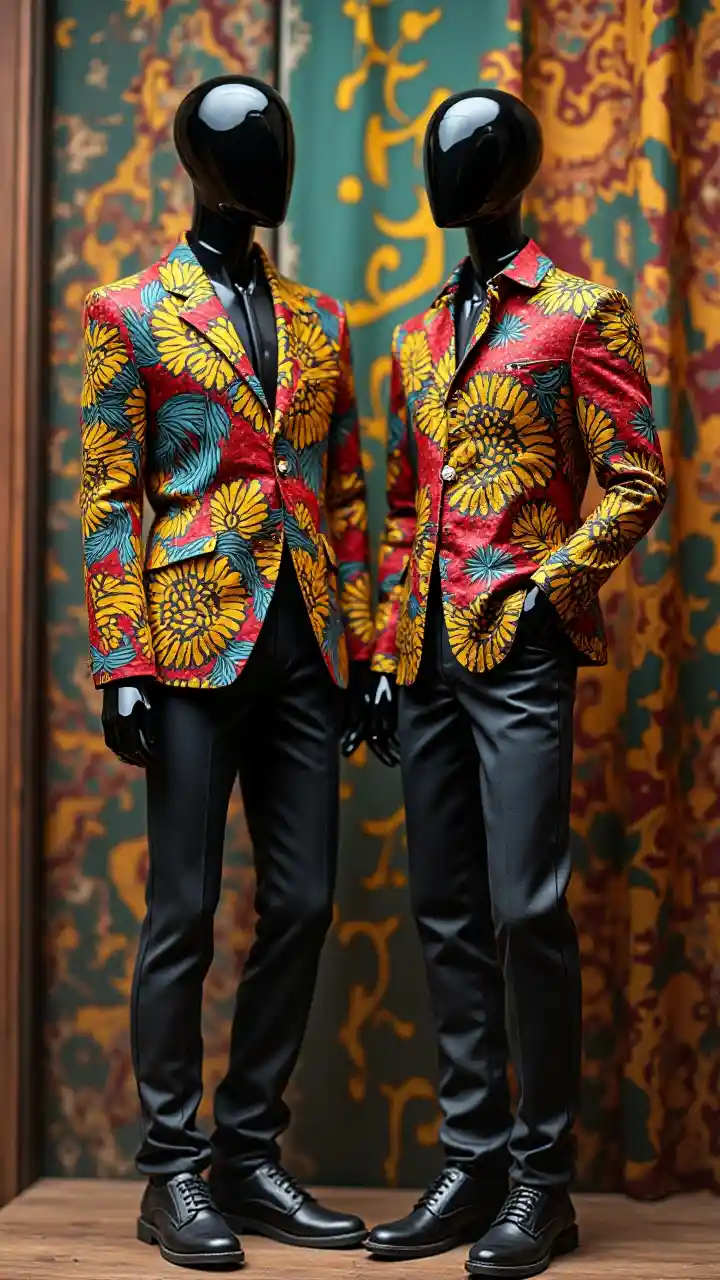 Avec un style très naturel, la combinaison adopte un usage de marque de fabrique de couleurs et de coups de pinceau audacieux. Sportiv mannequins masculins et féminins en ébène, dandy africain, style sportif, style années 80, afrobeat, veste personnalisée chemise africaine, tissus colorés, rideaux africains, mode, ébène, noir, mannequins, modèles 3D, couples, image centrée