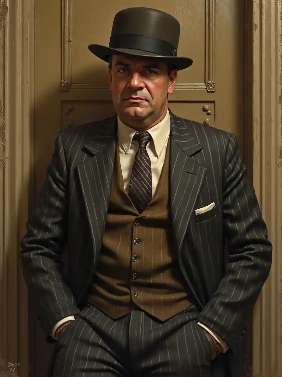 Portrait d'Al Capone dans son emblématique costume à fines rayures, hautement détaillé, rendu réaliste, teintes vintage tanné, peinture numérique, tendance sur ArtStation, art de Greg Rutkowski, Alphonse Mucha et Norman Rockwell