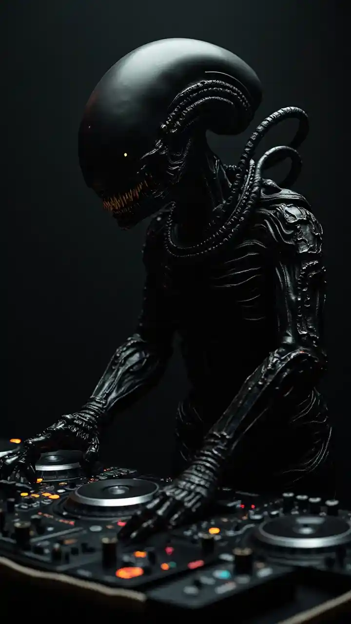 JackAlien, Alien, avant-gardiste, simplygo, spread, habillé tout noir, noir, harpiste bizarre, surréaliste jouer techno dj en carnaval