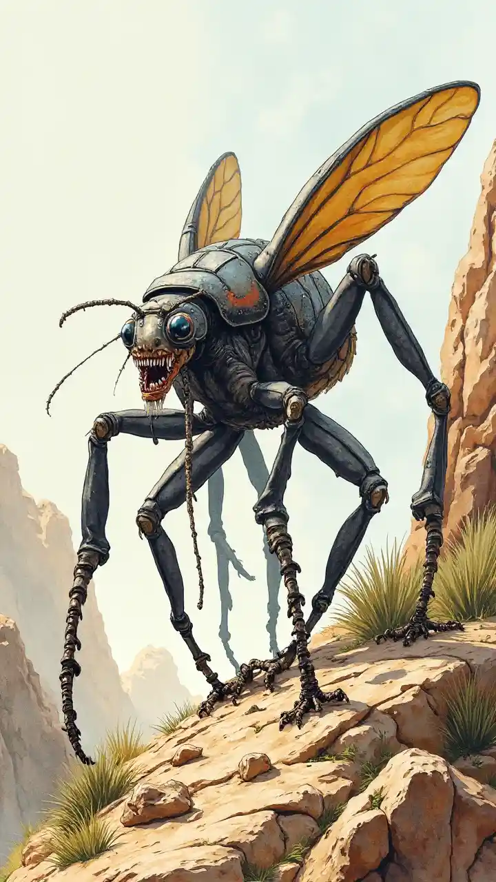 Art aquarelle, dessin d'un insecte d'horreur géant préhistorique organique extraterrestre, style STARSHIP Troopers Bugs Attack Cinéma et topographie britannique Paysage rocheux préhistorique de jadran et paysage végétal du désert, illustrations peintes, grisaille, trompe-l 'âil, wimmelbilder, paysage côtier, Animaux caractéristiques --ar 5:7--s 1000