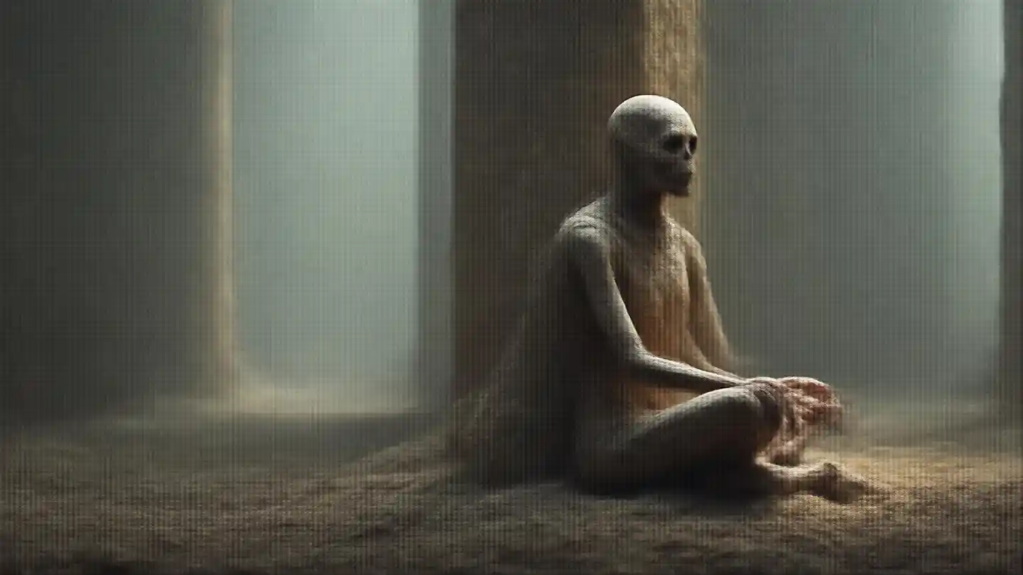 AuroraUne photo de corps d'une horrible momie extraterrestre décadente, méditant sur une vie passée, dans un ancien temple impérial extraterrestre longtemps oublié. Lancer de rayons, horizon, l