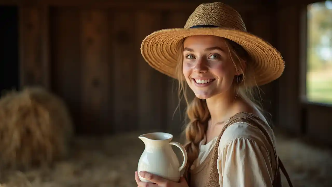 (Jeune dame de 22 ans d'Amish), mince et mignonne, avec de longs cheveux blonds attachés sous un chapeau de paille d'Amish, tenant un pot de crème en céramique, un sourire timide et expressif, autour d'elle Dans la grange, une atmosphère chaleureuse et attrayante, lumières naturelles douces, arrière-plan rustique amish, les traits du visage des détails capturent l'atmosphère de jeunesse, portant des costumes traditionnels amish, haute définition, super méticuleux.