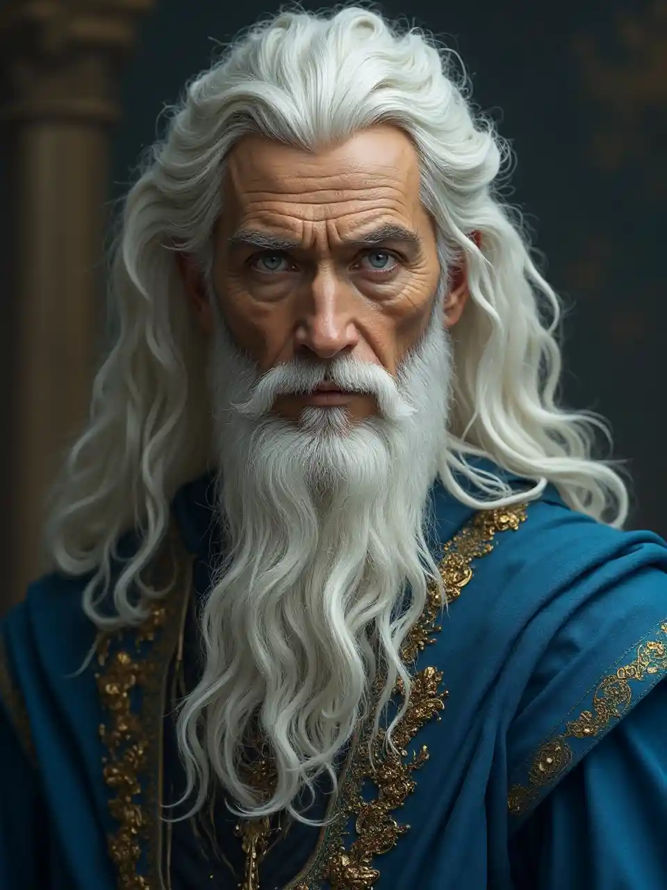 Un homme d'âge moyen pâle, aux longs cheveux blancs et aux yeux bleu clair. De riches robes bleues, accompagnées d'un décor doré. Les temps anciens.