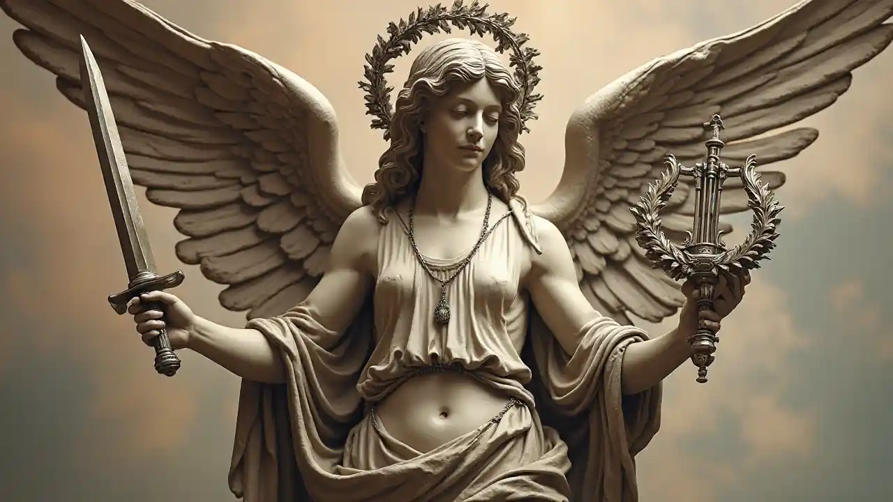 Un tatouage de style réaliste, une statue d'ange à 4 bras, une épée à la main, un livre, une gerbe de fleurs, une lyre