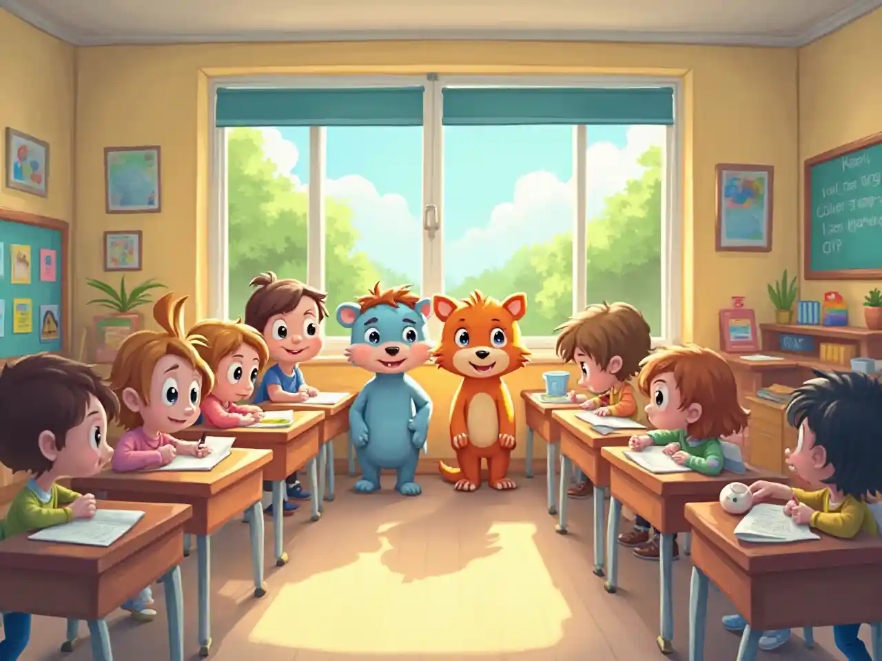 IsaiahLes élèves d'animaliers de dessins animés entrent dans les salles de classe colorées de la maternelle.