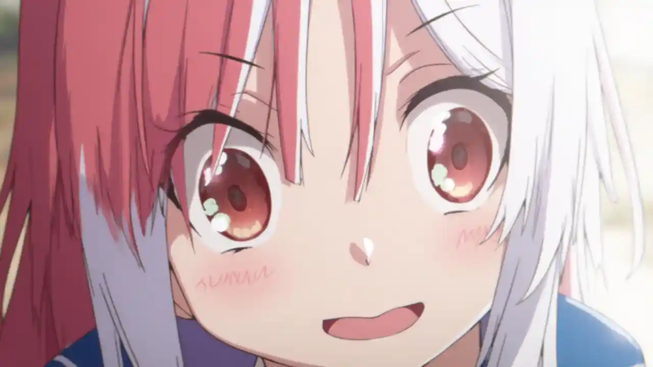 Gros plan sur un personnage animé aux cheveux mi-blancs mi-roux, souriant et en uniforme bleu et blanc.