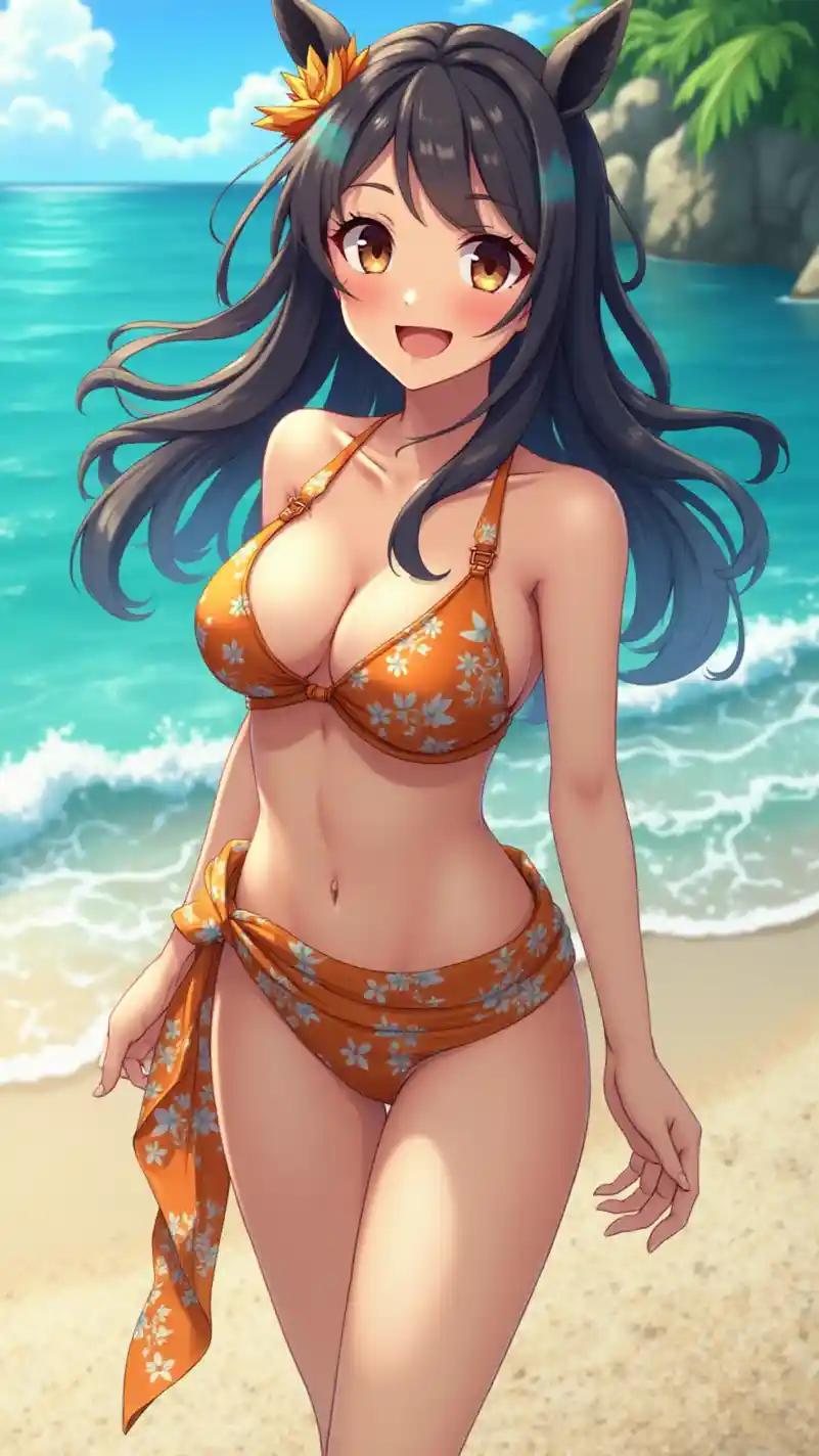 Une fille d'animation ultra-haute définition à grande échelle verticale, magnifique, audacieuse et époustouflante, baignée de soleil, debout sur une plage extérieure battue par les vagues, vêtue d'un bikini tropical à décolleté profond, d'un tablier fleuri et de longs cheveux humides de l'océan. Un sourire confiant, des yeux larges, une peau rayonnante, une palette vibrante de bleu et d'orange, des traits pointus, un maquillage parfait, une atmosphère aventureuse et rafraîchissante, une lumière douce et un éclairage naturel, Elle met en valeur sa poitrine charmante et ciselée et son décolleté subtil, ainsi que ses jambes longues et bodybuildées dans une posture détendue, dégageant beauté et vitalité.