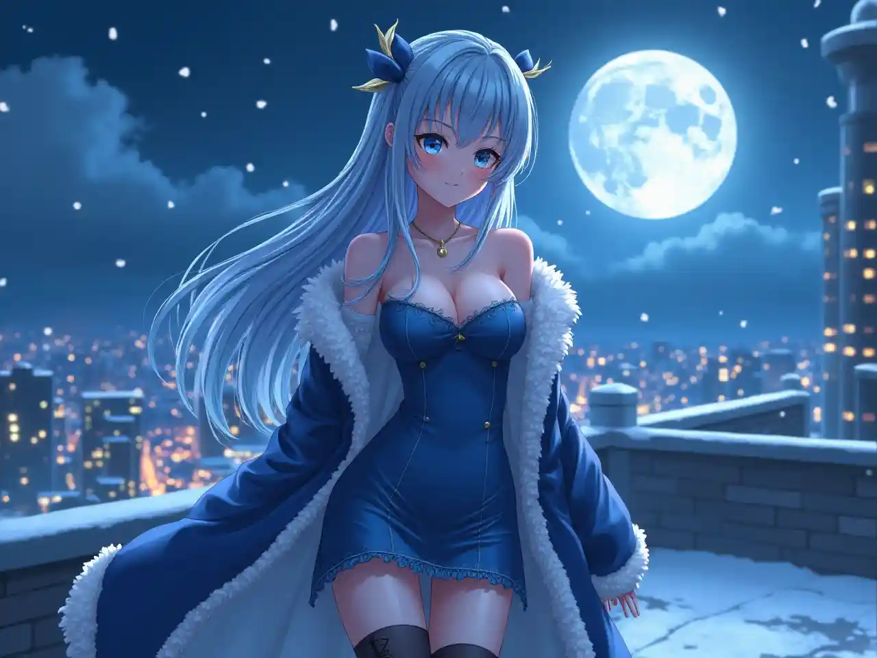 Une fille d'animation ultra-haute définition avec une image horizontale et à grande échelle, belle et radieuse sous la pleine lune, debout sur un toit enneigé à l'extérieur, avec des lumières de la ville en dessous, vêtue d'un manteau à bords bruts, avec une robe moulante avec un décolleté bas et des cuisses hautes. Chaussettes, cheveux longs scintillants de givre et sourires sereins, peau scintillante aux grands yeux, palette bleue et argent glacée, traits exquis, maquillage impeccable, atmosphère magique et romantique, lumière douce et atmosphère d'éclairage, Elle met en valeur sa poitrine sexy et ciselée et son décolleté subtil, ainsi que ses jambes longues et bodybuildées calmes, dégageant mystère et beauté.