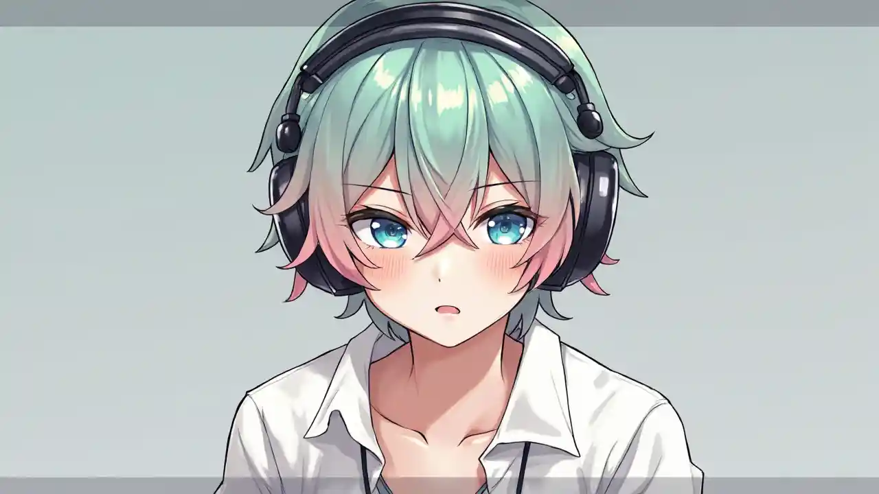 Un garçon animé avec des écouteurs noirs sur la tête, une chemise blanche, des yeux bleus et des cheveux verts prend une photo frontale. → Sprite → Rendez vos cheveux roses → Rendez vos cheveux roses saumon