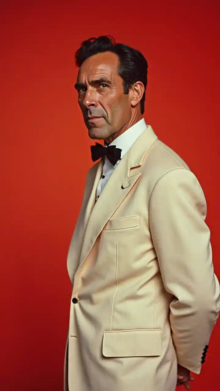 Portrait d'Anthony Bourdain vêtu d'un costume léger aux bords épais noirs, portrait en cuisine style publicitaire des années 50, fond rouge, mise au point acérée, détails élevés, publicité rétro, style rétro
