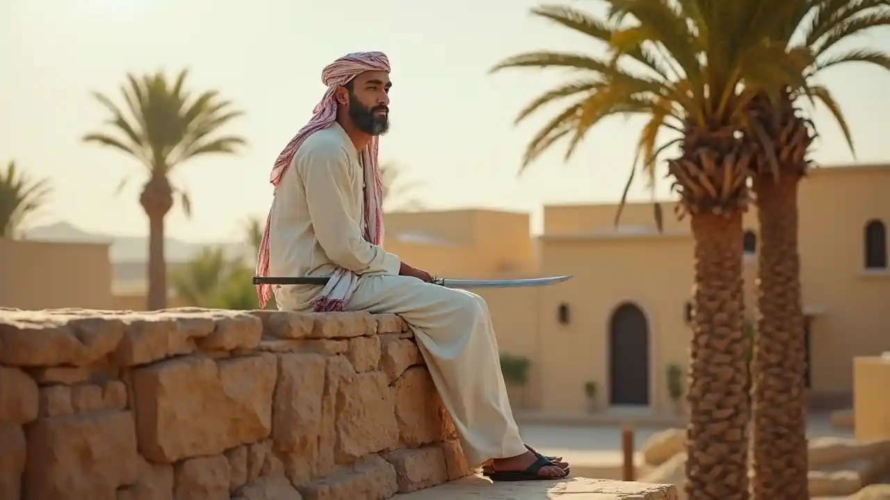 Un grand érudit musulman, assis sur une pierre surélevée près d'un palmier. Style omanais, arabe antique, robuste, arabe de 25-20 ans armé d'une épée, arabe portant une vue de coin rapprochée, avant lui certains hommes arabes musulmans sur fond flou Les arabes ont placé des palmiers sur fond flou.