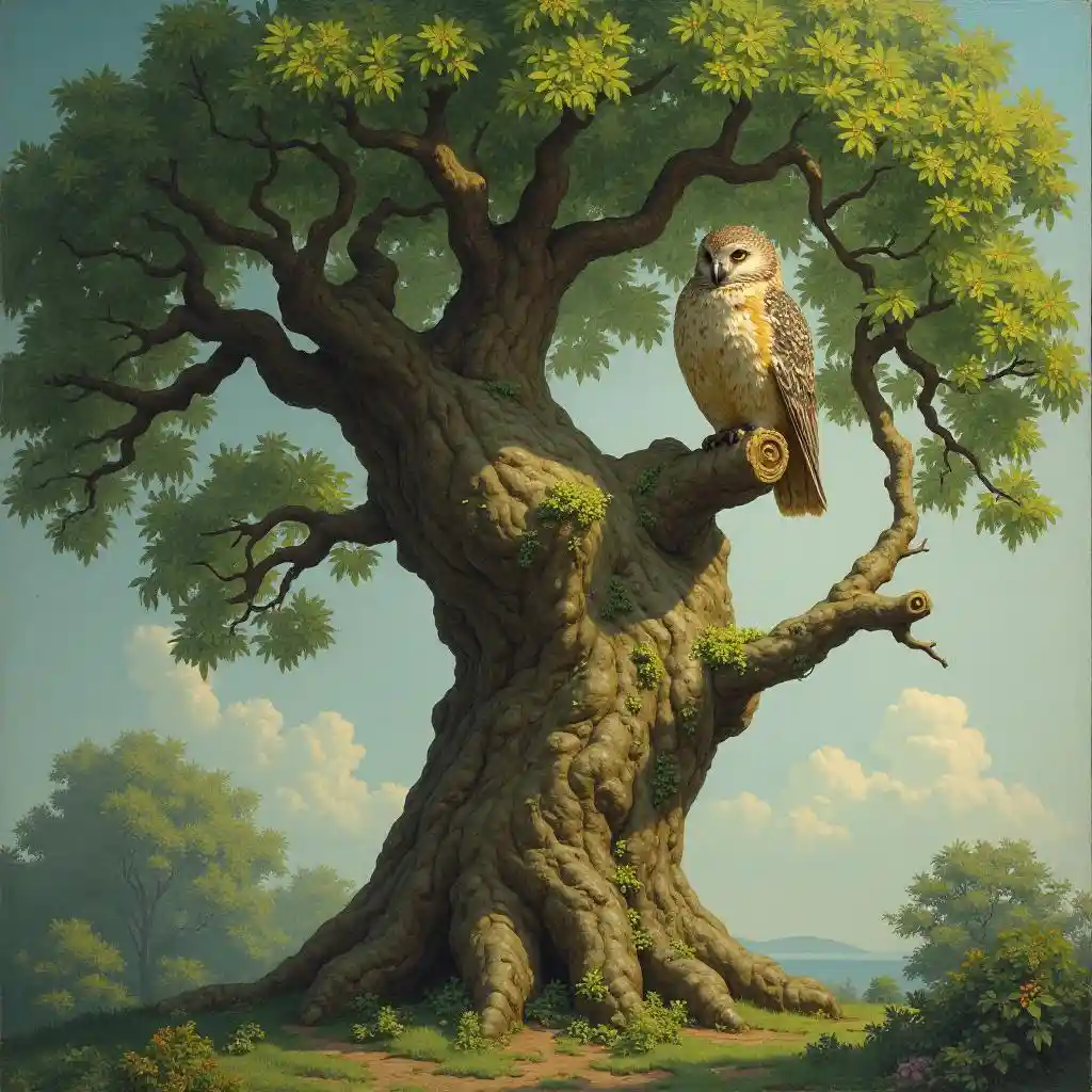 Dans le trou du tron de l'arbre se situe une chouette et sur la branche de cette arbre se trouve un oiseau