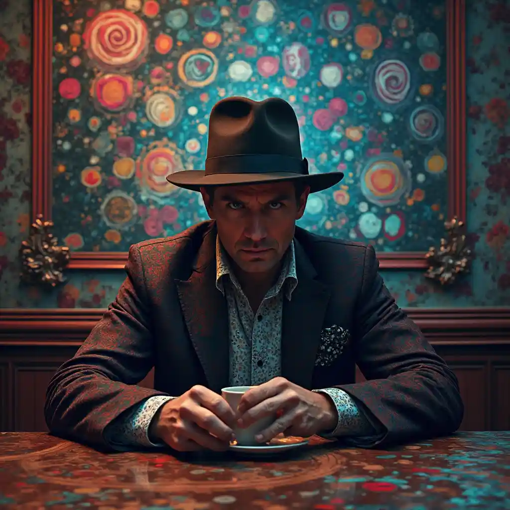 L'homme est assis devant une table, une tasse de café devant lui, portant un chapeau élégant, un style isolé, un design ultra-minimaliste, des couleurs vives, des motifs complexes, une atmosphère immersive, des textures riches, des éléments surréalistes attrayants, des lumières à contraste élevé créent de la profondeur, visuellement chaotique mais harmonieux, une composition charmante, une qualité 4K, ultra-détaillée, un chef-d'œuvre artistique.