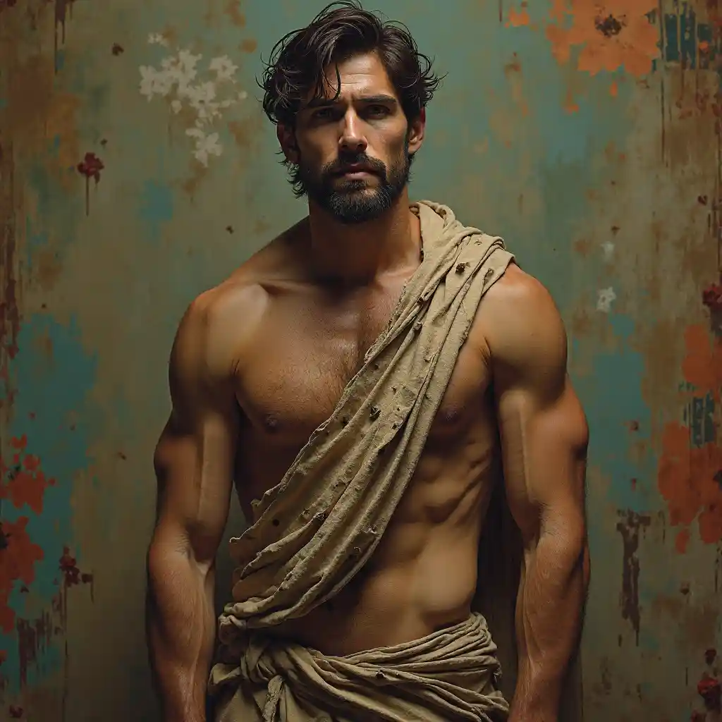 Drapé dans un linge en lambeaux et altéré, l'homme est musclé et étonnamment beau, avec un fond complexe et vif. La fonction est méticuleuse et méticuleuse, montrant une apparence réaliste dans des tons naturels. Realistique et réaliste, la définition 8k associée à un éclairage tranchant et net capte un style qui rappelle l'esthétique tendance Tumblr. Inspirés par les influences artistiques d'Artgerm, Greg Rutkowski, Alphonse Mucha, Loish, WLOP, mêlent des virages dynamiques d'originalité.
