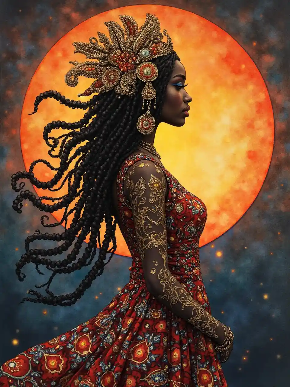 La déesse noire gitane roumaine, brillant coucher de soleil dramatique, guérit les âmes. Motif Paisley. Fantaisie élégante, complexe, très attrayante, belle, paysage fantastique primé, super réaliste, super détaillé, haute définition, qualité croustillante, aquarelle Arthur Rackham Gustav Klimt, stylo et encre Johannes Vermeer Rebecca Guay Michael Parkes ouvre les yeux Ella du Cane belle, élégante et complexe, fantaisie très attrayante