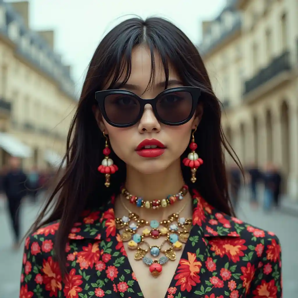 Jeune mannequin asiatique, cheveux noirs Bob longs, sourcils épais, silhouette élancée, grandes lèvres rouges, maquillage doux, boucles d'oreilles en silicone florales longues, collier floral en silicone long, aztecque exotique, inspiration maya, lunettes de soleil à géométrie noire, cadre épais, tenue de jogging florale, à Paris, vue de face, objectif 35mm, bokeye, style alexa chung, tim walker
