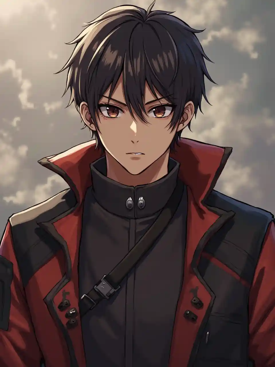 SophiaUn héros masculin asiatique vêtu d'un manteau noir et rouge, de cheveux courts noirs, d'yeux marron foncé et de peau brune.