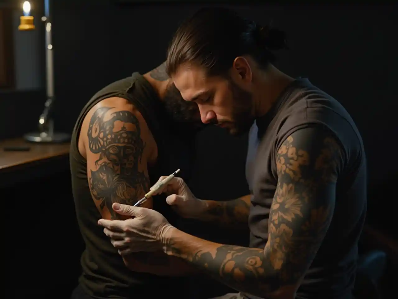 ScarlettTatoo, un artiste asiatique masculin d'une trentaine d'années dans un environnement sombre avec des lumières dramatiques