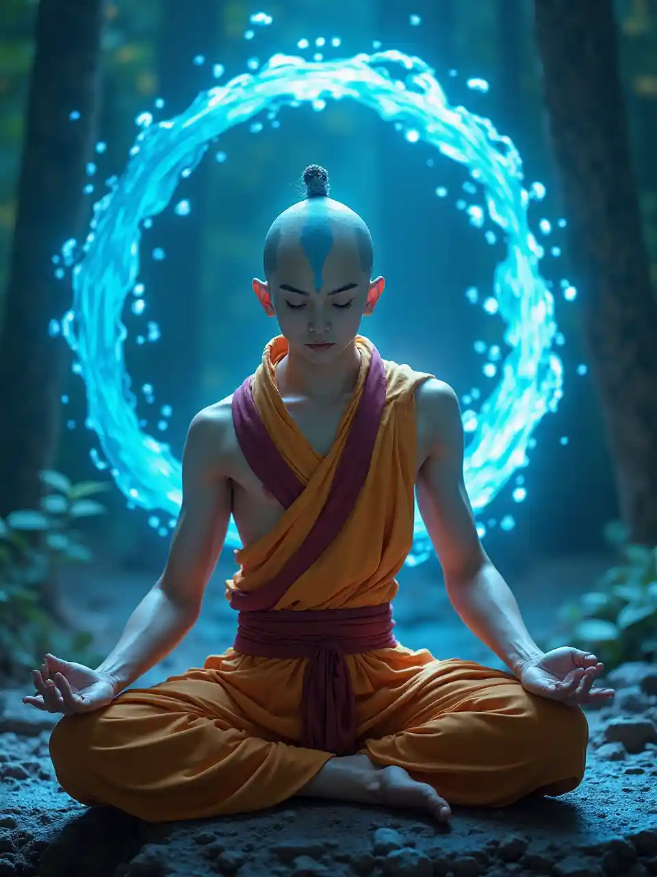 La pose méditative d'Avatar Aang dans un paysage spirituel fascinant