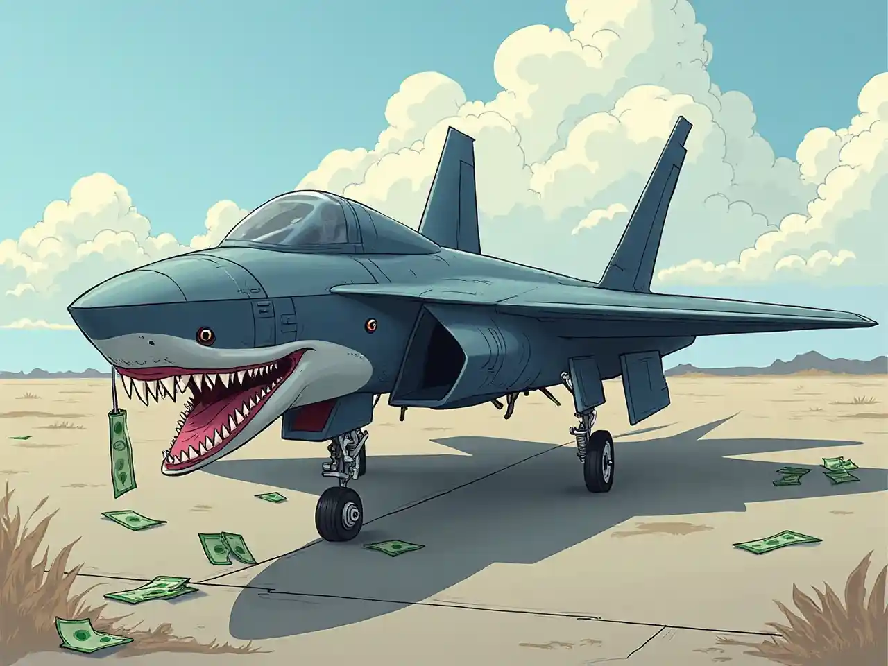 Avion bombardier furtif B2 de style dessin animé, le nez avant s'est transformé en un visage de requin. Les requins devraient avoir des billets d'un dollar accrochés à la bouche. Il devrait y avoir des billets en dollars éparpillés un peu partout.