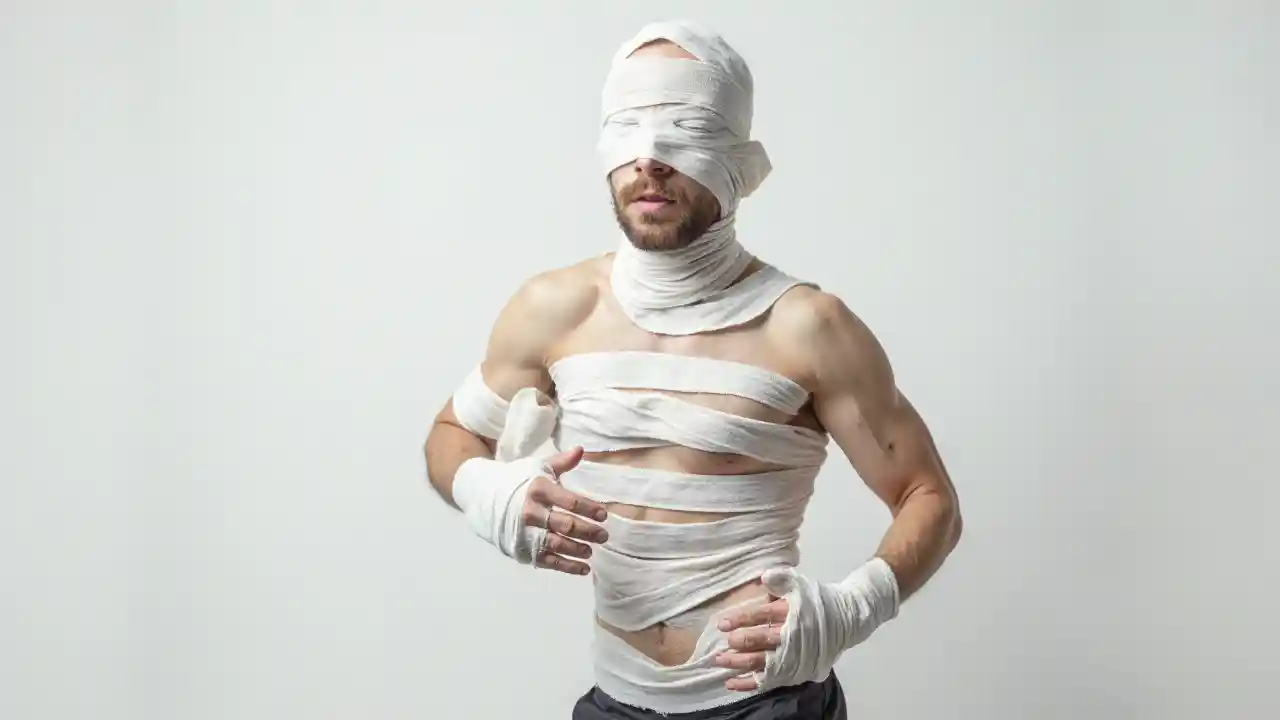 MatthewPhoto d'un homme avec un pansement de style réaliste, costume d'Halloween, fond blanc, corps entier, mains, cou et tête