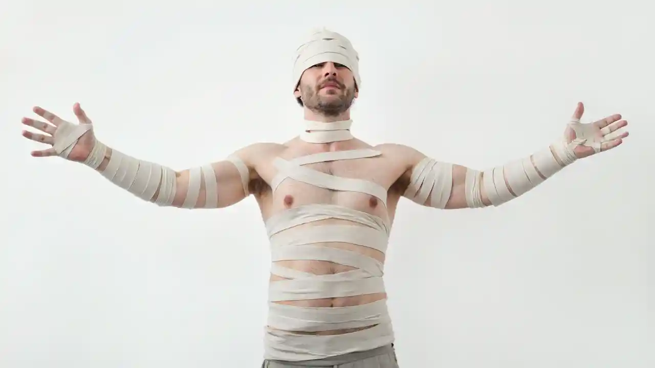 Une photo d'un homme dans un style réaliste avec les bras enroulés autour d'un bandage, sur fond blanc, sur tout le corps, avec ses mains, son cou et sa tête, debout devant
