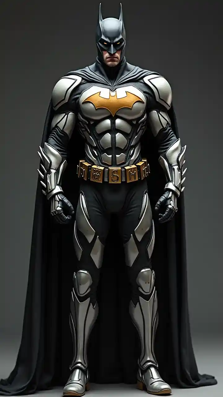 JonathanRôle de Batman sur tout le corps, réaliste, hyper-détaillé, bonne posture dynamique, mise au point nette 8K, détails élevés, réalisme, ensemble de luxe blindé avec détails chromés blancs et dorés et noir mat