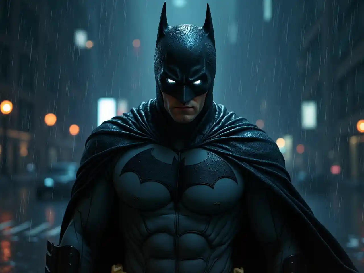 AvaBD réaliste Le Batman de précision a les yeux blancs brillants et lumineux dans un costume Batman sous la pluie nocturne de Gotham City