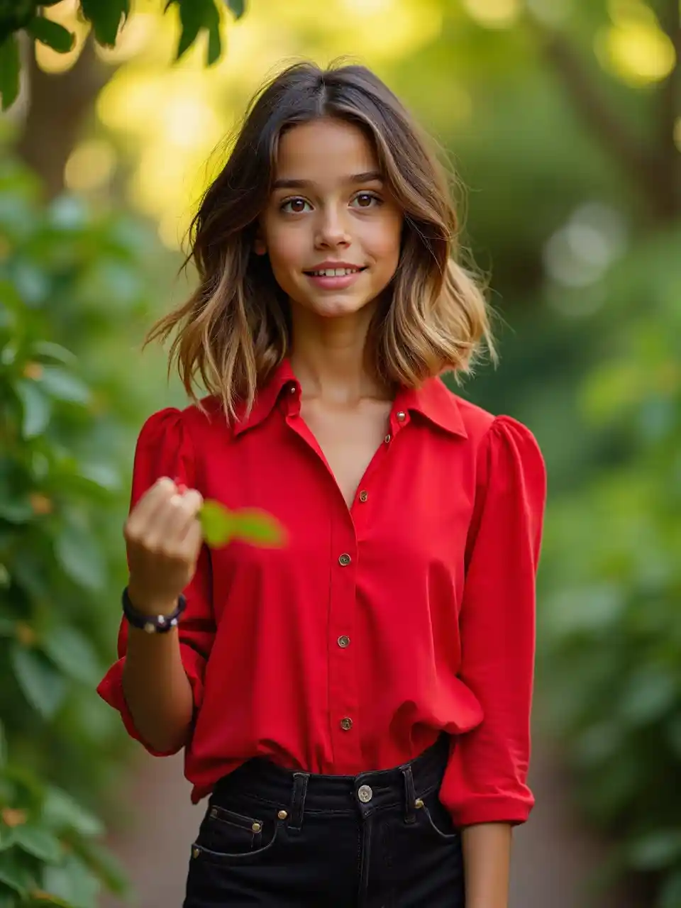 Portrait robuste d'une étonnante et belle jeune fille aux origines ethniques mixtes, avec une peau naturelle immaculée, une coiffure de bob moyenne chic et des points forts blonds mélangeant cheveux noirs et baisers ensoleillés. Vêtue d'une chemise rouge énergique avec un jean noir lisse, elle se tient dans un environnement extérieur calme entouré de plantes vertes luxuriantes, ce qui renforce son sens charmant de l'existence. La douceur du soleil ajoute un éclat chaud et une lumière haute à sa peau, créant un mélange harmonieux d'élégance et de nature.