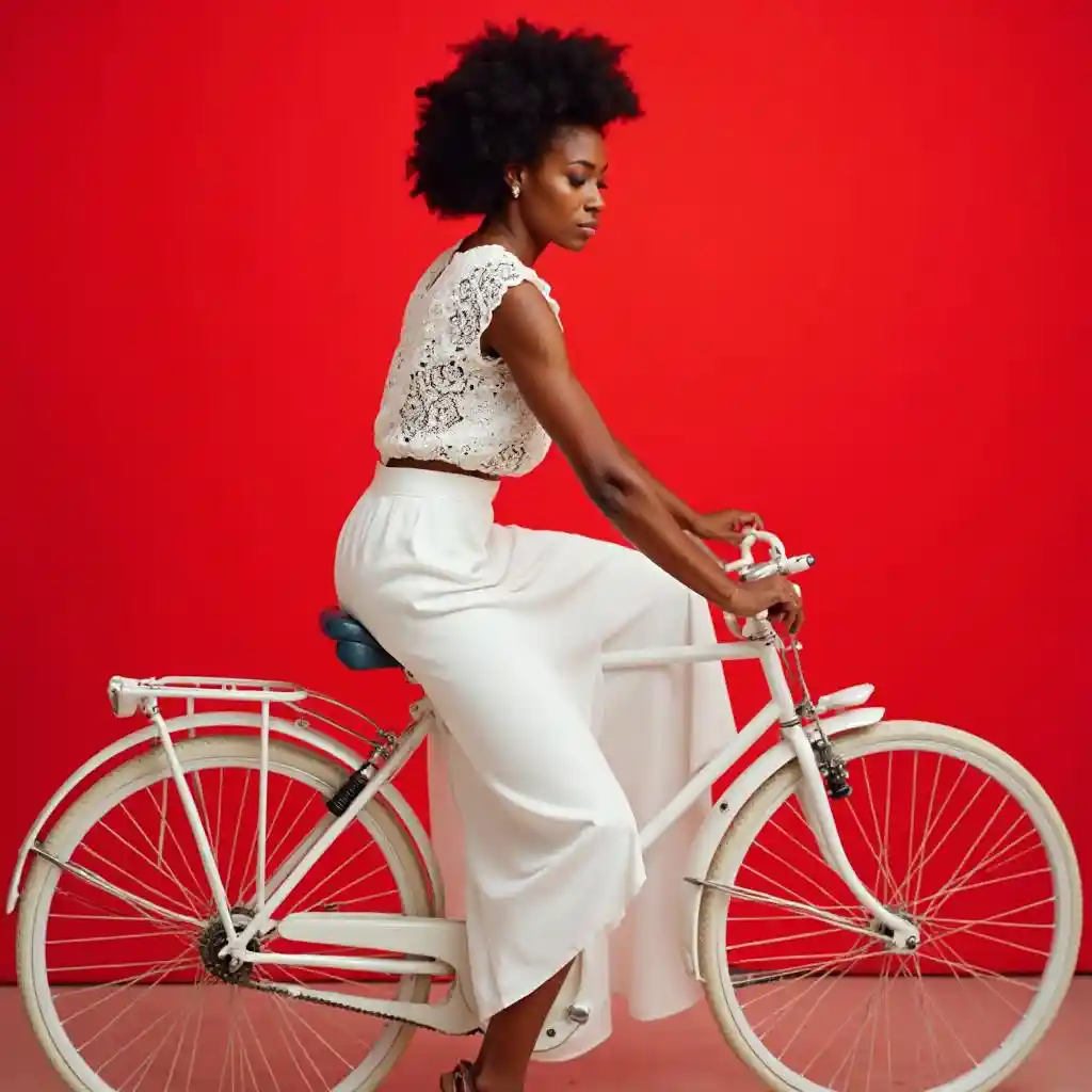 Une femme à la coiffure sombre africaine, sur un vélo blanc sur un fond rouge vibrant. Elle est vêtue d'un haut en dentelle blanche et d'une longue robe blanche. La femme semble être sur le côté, le regard devant elle avec un air calme. Le vélo est d'un design classique, avec un cadre blanc et de grandes roues. L'ensemble du plateau dégage un sentiment d'élégance et de sérénité.