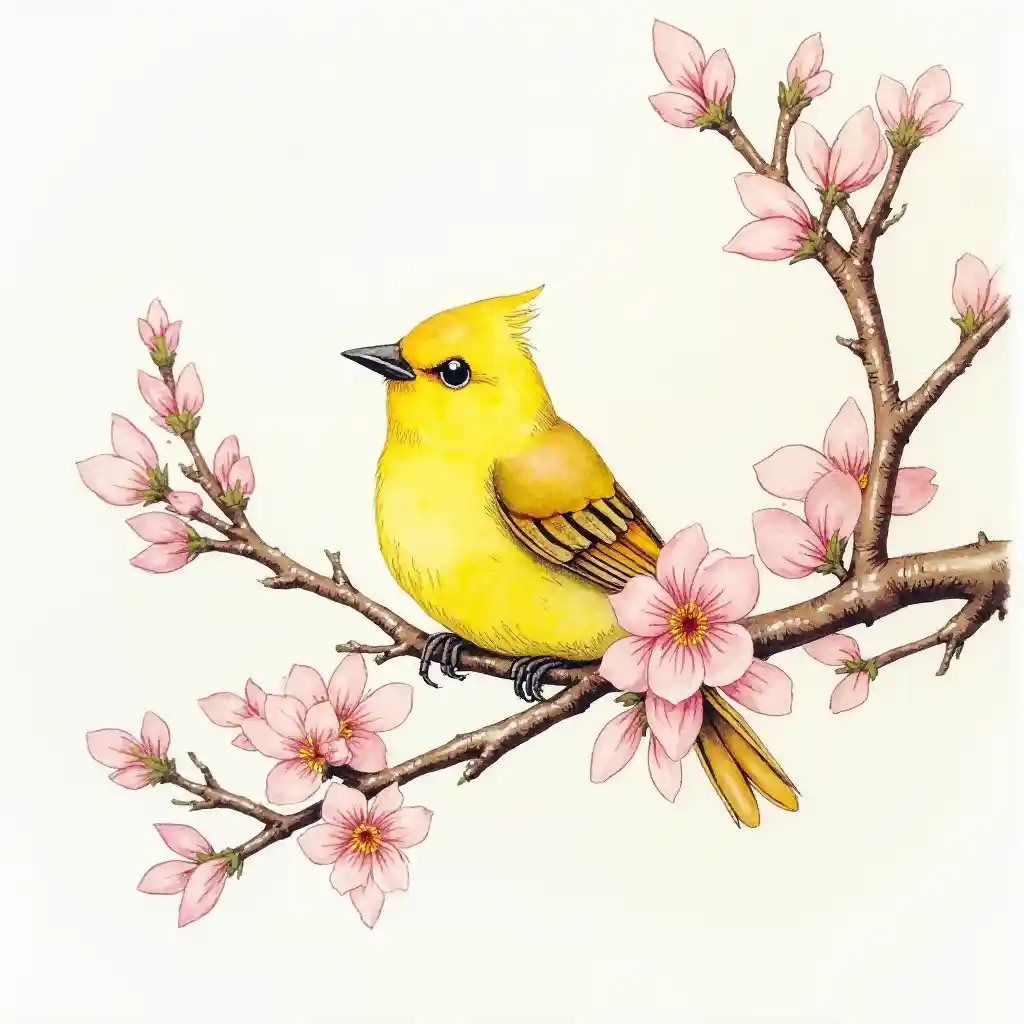 TinaDes oiseaux jaunes assis sur des fleurs et des arbres à l'aquarelle