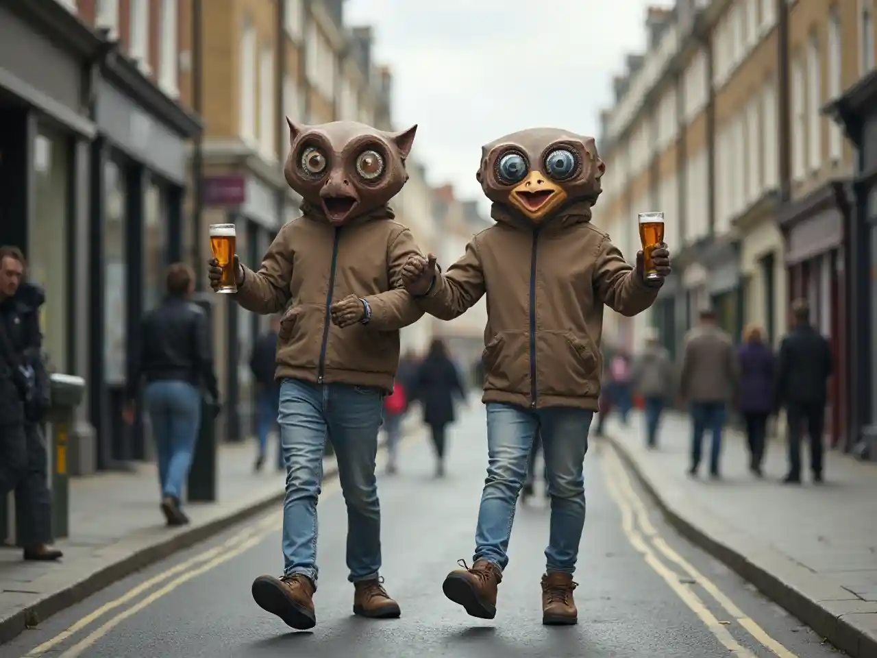 Photo réaliste d'un homme marchant dans une rue de Londres, pieds comme des oiseaux, trois bras et deux têtes, en 2025. Une tête semble géométrique, l'autre possède 5 yeux. Ils devraient paraître très excités, une pinte de bière à la main.