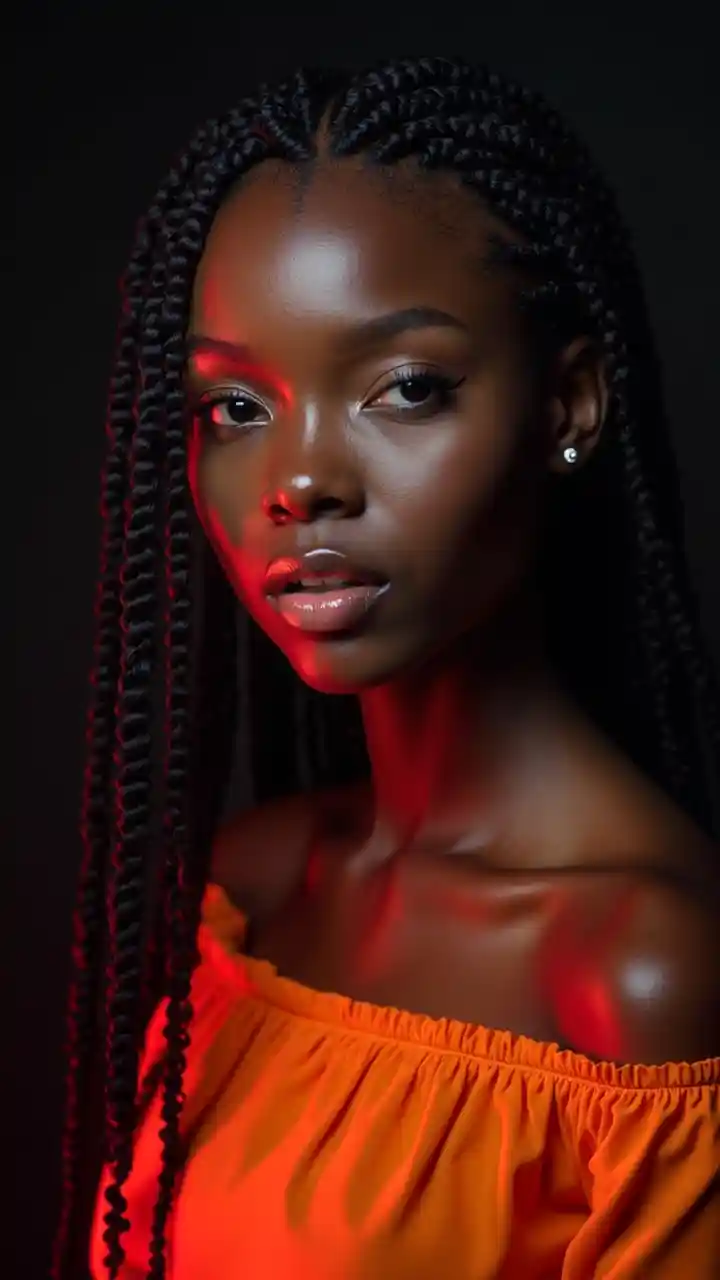 Portrait d'une belle fille noire avec une boîte, des cheveux noirs, une forme de modèle, un maquillage vif et un fond noir avec une lumière colorée. Derrière la fille, il y a une chemise vive, des lèvres pleines et une lumière contrastée.