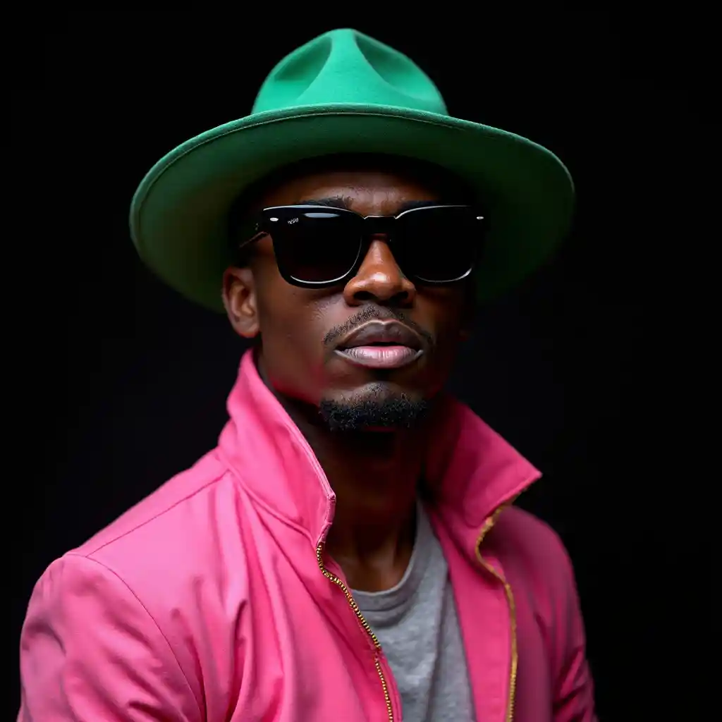 Le mannequin masculin à la mode noir porte une veste rose, un chapeau panama vert, de grandes lunettes noires, un fond noir, des couleurs vives et riches, des couleurs vives et saturées, une mise au point forte,