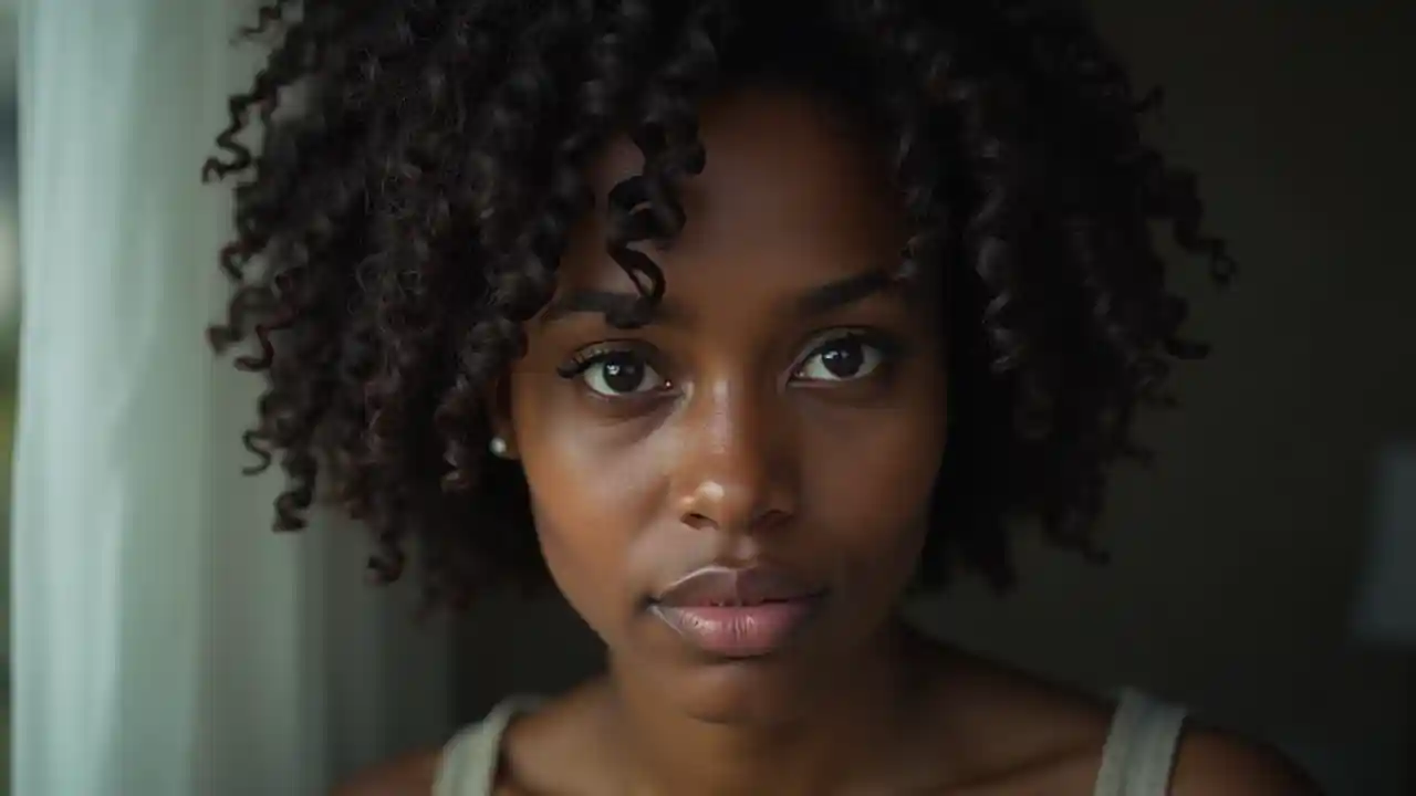 Une femme noire avec les cheveux bouclés fixant la caméra