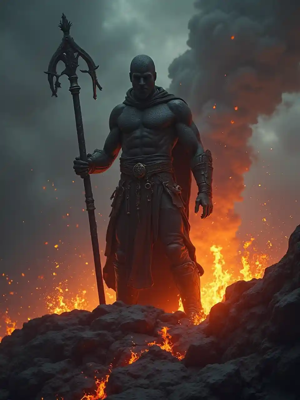 Un grand dieu forgeron vivant dans une tempête volcanique