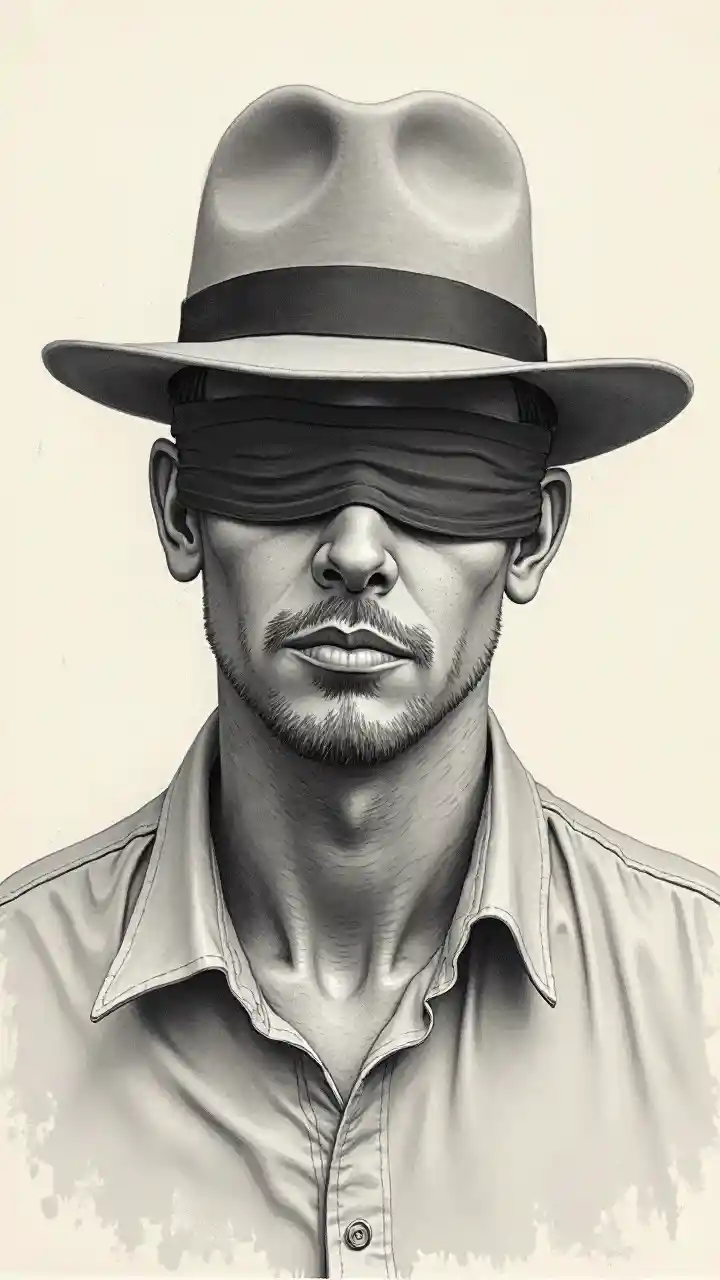 BraydenDessin d'un aveugle portant un chapeau et un bandeau de cheveux sur les yeux