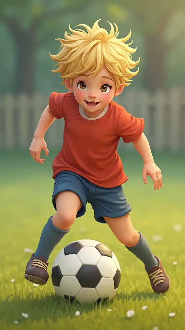 Un garçon blond, âgé de 8 ans, blond entend les yeux marron. Il joue au foot, c'est son anniversaire.