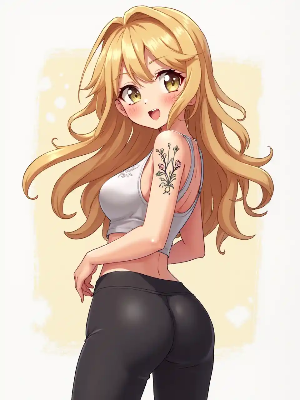 Doux, innocent, mignon (adulte de 30 ans) American Golden Animation Girl, legging et haut de nombril., Liste de conception de personnages. Tatouage "DRBlues", réaliste. Une posture dynamique et frivole, souriante.