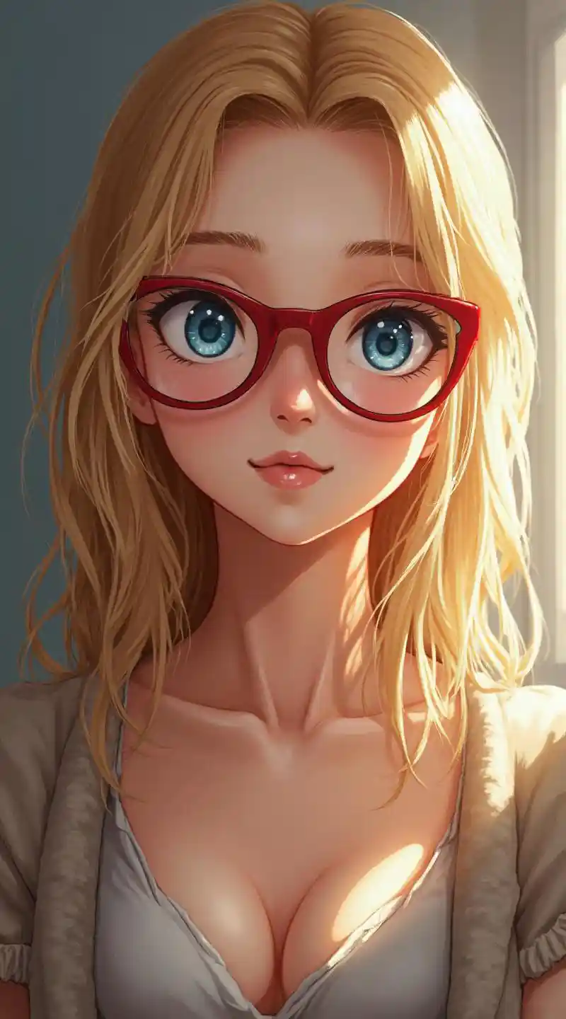 1 fille,, angle hollandais, contrapposto,, phare, sourire, yeux bleus, lunettes à monture inférieure à monture rouge, peau claire et lisse, lèvres brillantes, cheveux longs blonds décomplexés, coups bas