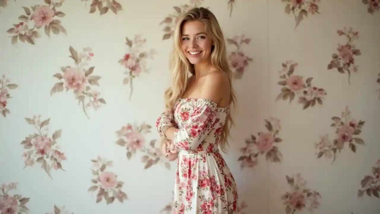 GrimIn full growth Portrait d'une jeune femme blonde magnifique et souriante portant des robes imprimées modernes, des talons hauts et de beaux motifs de papier peint modernes