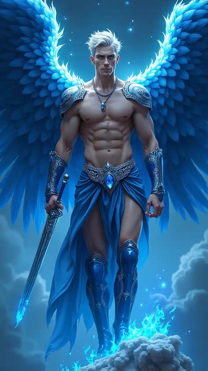 Un homme ultra masculin. Anges, royaume des cieux. Anges de l'étoile bleue. Grand, musclé, costaud, épaules larges, poitrine large, taille étroite, jambes fortes, corps olympien. Blanc et peau pâle. Beau visage, viril. Des sourcils épais, des mentons ciselés. Les yeux bleus électriques, profondément affectueux. Les cheveux courts ondulés ont une coiffure décolorée et les cheveux sont légèrement plus longs vers l'avant {{cheveux blancs}}. Un ruban bleu ciel est noué sur le front et le front. Les épaules argentées brillantes sont ornées de saphir, d'une chaîne en argent et d'un pendentif en saphir autour du cou. Il portait une ceinture de sécurité bleu métallique sur la poitrine et un bracelet bleu métallique attaché à son bras. Une magnifique ceinture argentée sertie de saphir à la taille. Il portait sur ses organes génitaux assez impressionnants un linge bleu ciel avec des bords/rouleaux argentés, qui ne les couvrait presque pas, révélant ses jambes fortes et musclées. Forte texture métallique des genoux, bottes bleues de même couleur. Ses ailes d'ange massives et semblables à des plumes sont principalement bleues cobalt et deviennent progressivement bleues plus claires vers l'extérieur des ailes. Il portait une épée de guerre géante faite d'une flamme bleue et il dégageait une aura bleue parce qu'il était l'ange de l'étoile bleue. La posture du corps entier. Il est quelque part parmi les stars.