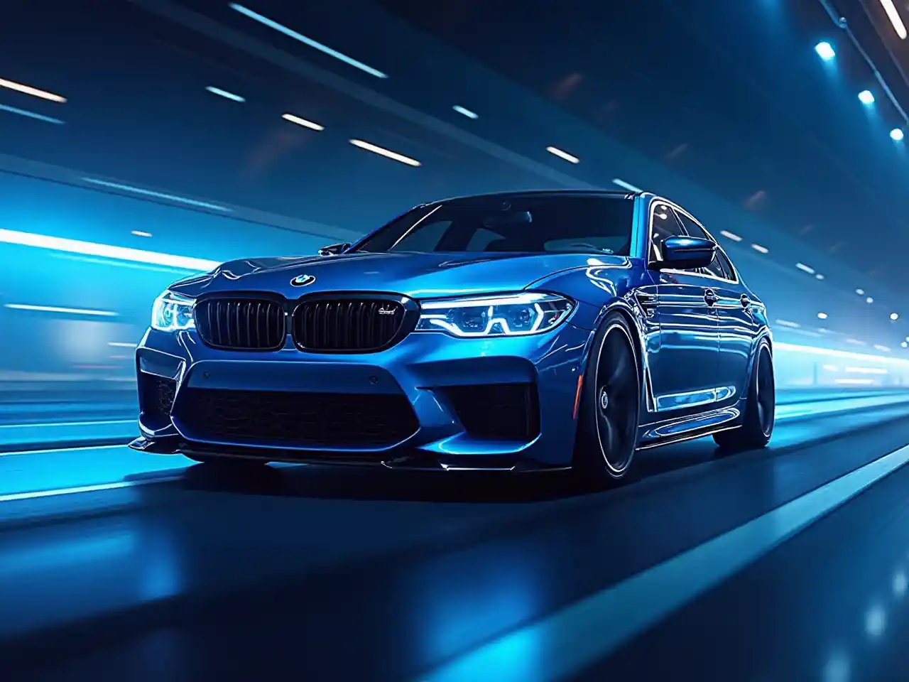 BMW M5 cs dans l'espace et les néons bleus volent ensemble