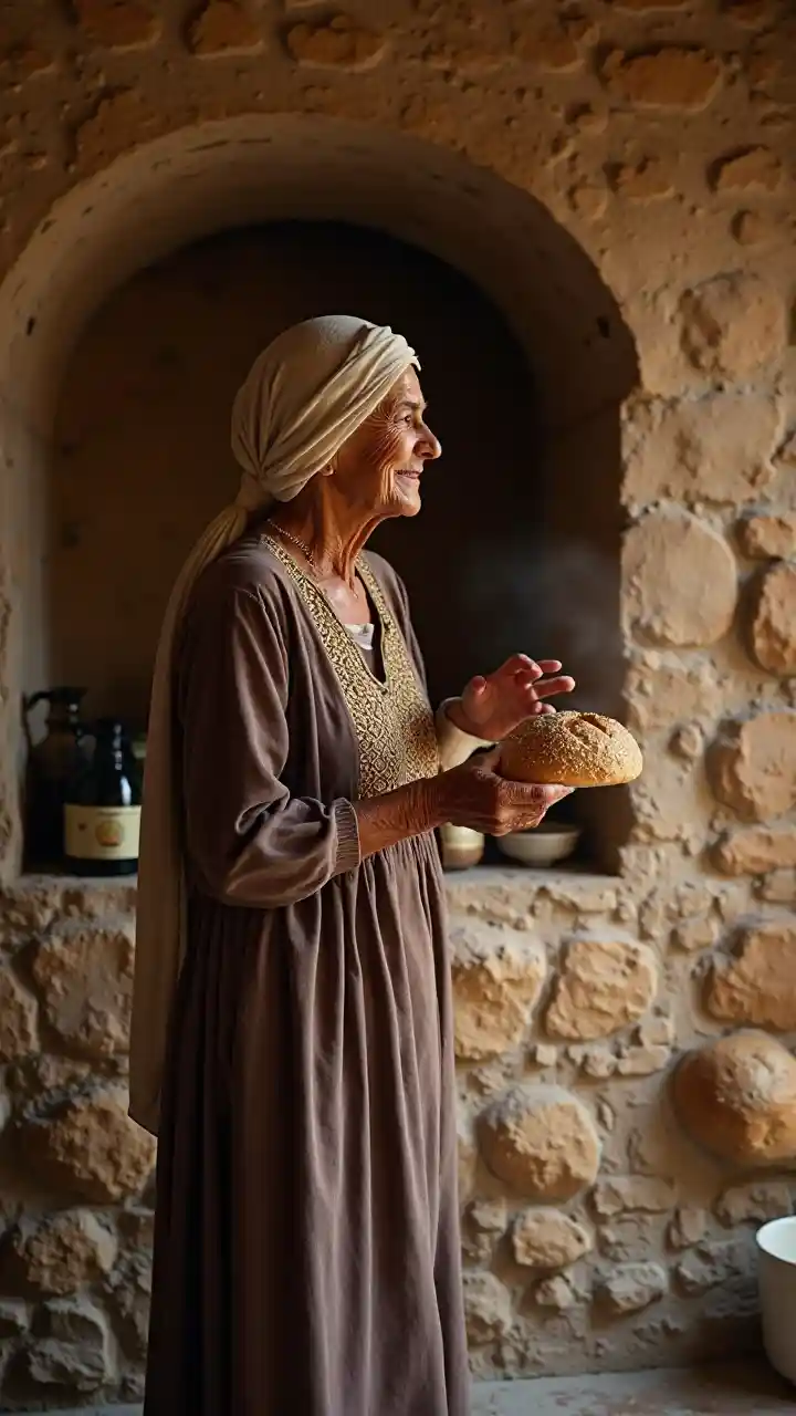 Au four de pierre, une femme de 75 ans au Moyen-Orient portant un turban porte une robe brodée de blé. Les murs de briques de boue et les pots d'épices l'encadrent, et son pétrissage minutieux dégage chaleur et traditions culturelles dans un environnement historique confortable. Son parfum imprègne tout le village.